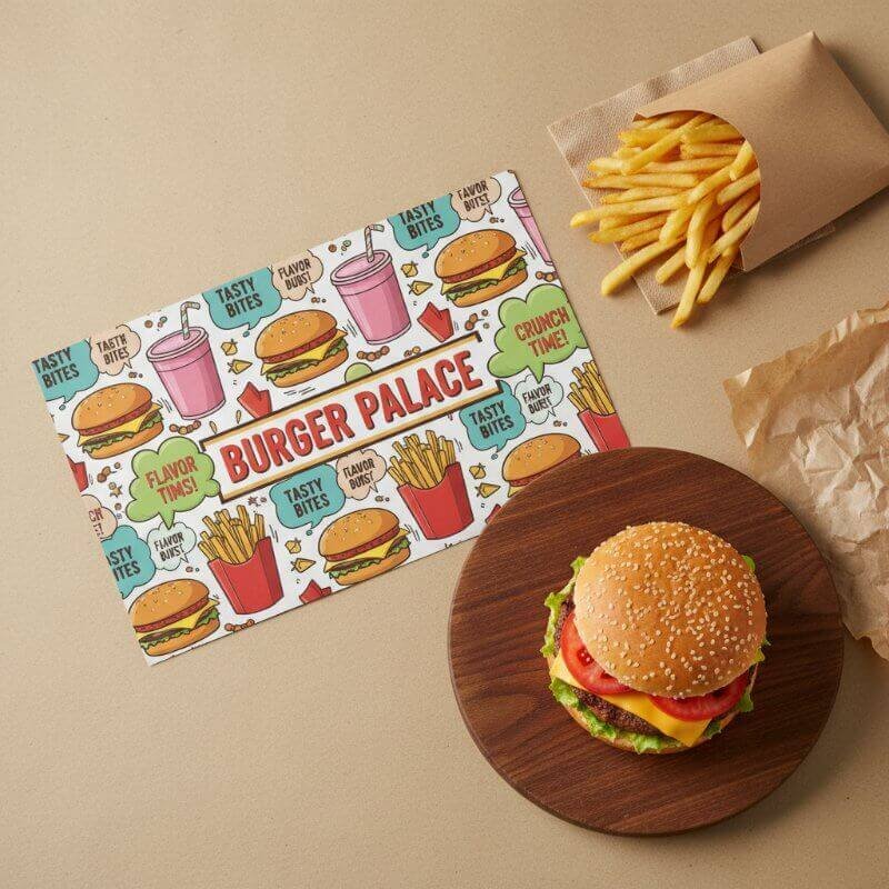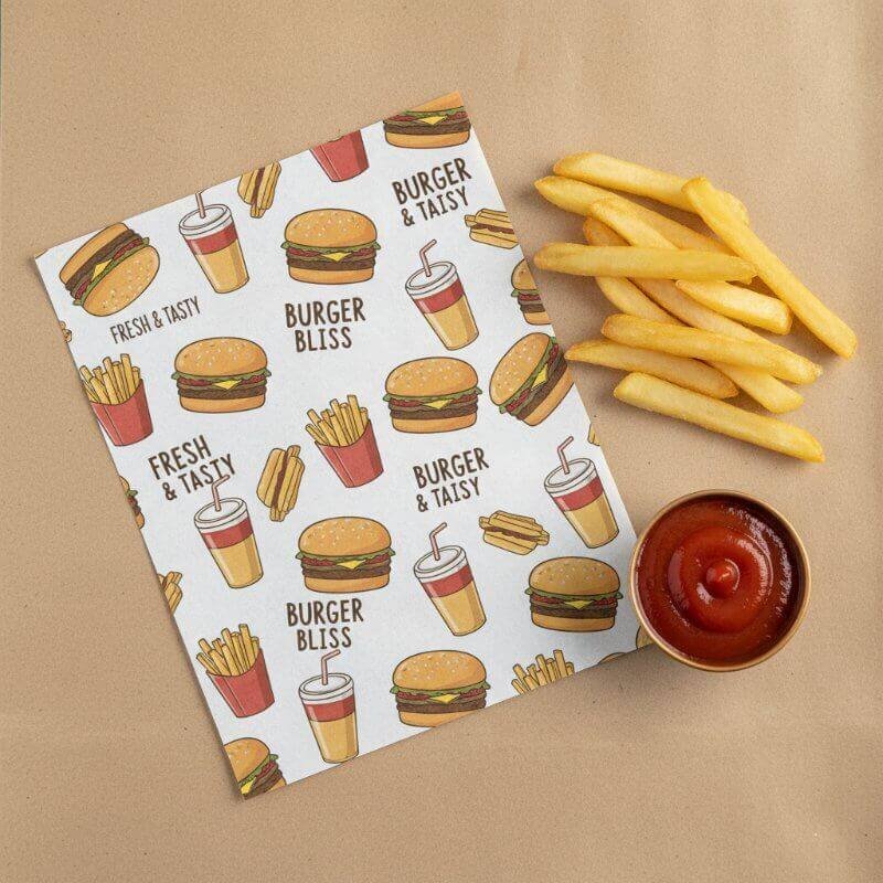 Fast food businesses require papers for their burgers that won’t stick to their burgers. That is why we offer custom burger paper wraps for them. These papers are ideal for both hot and cold burgers. Our personalized burger wrap paper comes with a non-stick property so you can be rest assured that your burgers will not stick to the paper. Not only that, these custom paper to wrap burgers are super durable so you can be rest assured that they won’t tear during shipping.